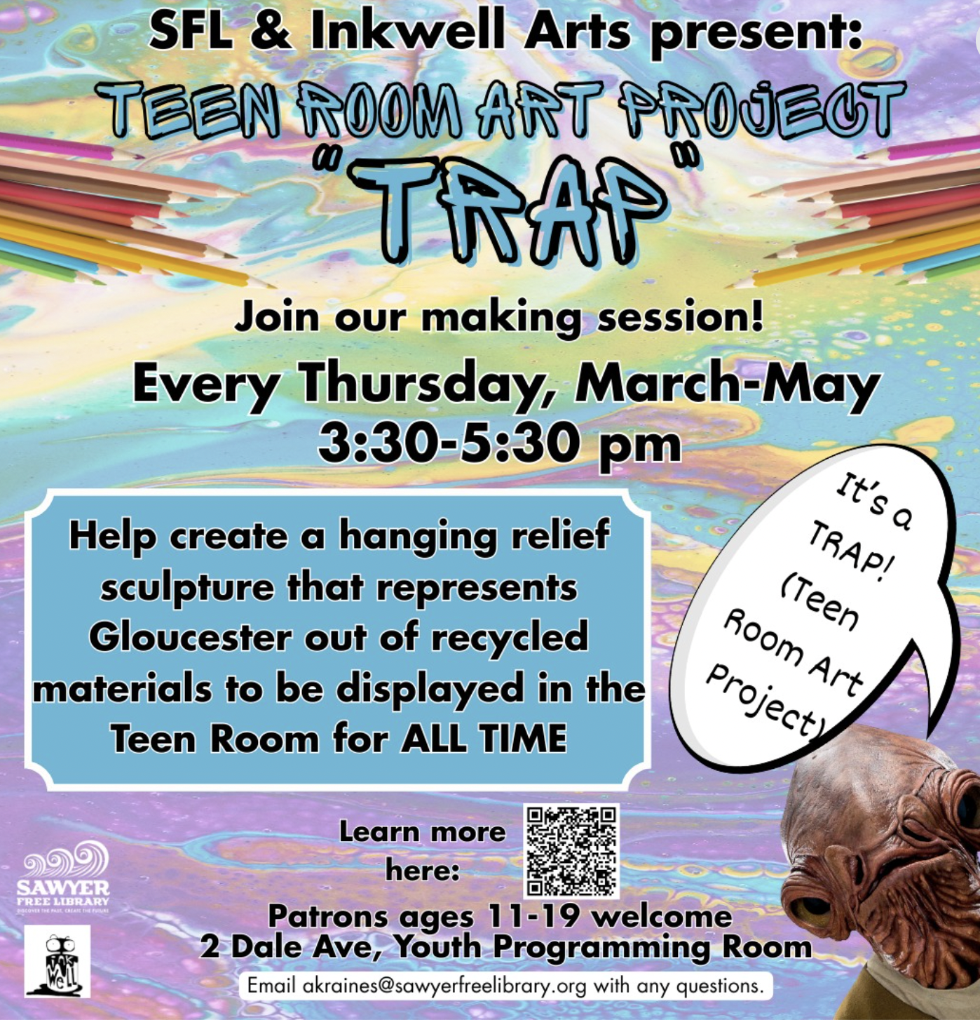 Teen Room Art Project (TRAP) at Sawyer Free Library Thursday, April 16, 2026 3:30 PM Thursday, May 28, 2026 5:30 PM Sawyer Free Library 2 Dale Avenue Gloucester, MA USA (map) Google Calendar ICS