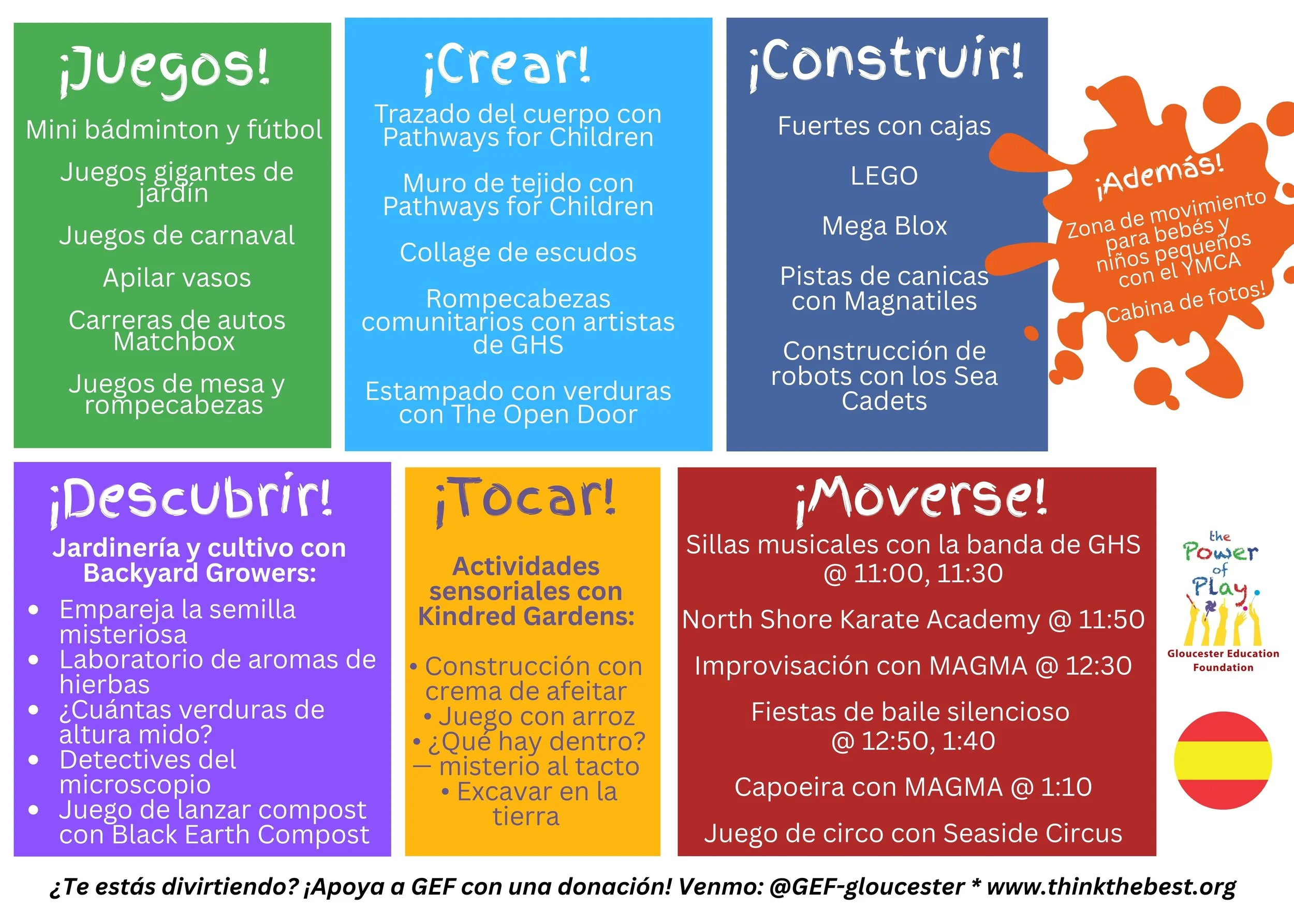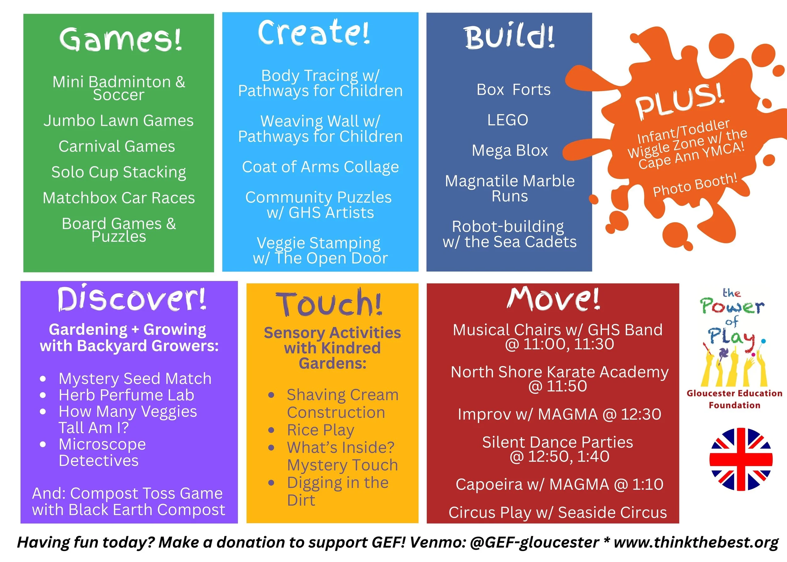 GEF’s annual “Day of Play” is back for an 8th year on Sunday, March 22, from 11am-2pm! This FREE community event draws hundreds of Gloucester families to the GHS Field House to participate in dozens of fun activities, led by community volunteers and partners. Check out photos below from past years by community volunteer Marty Del Vecchio and GHS student photographers, and this video by 1623 Studios! Together, they will give you a taste for this beloved event. See below for this year’s activity schedule in English, Spanish and Portuguese.